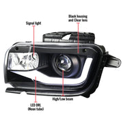Upgrade your 2010-2013 Chevrolet Camaro with these 6th Gen Style Projector Headlights, designed exclusively for OEM bumper fitment. Featuring a sleek black housing with a clear lens, these headlights include an integrated LED light bar for a modern, aggressive look.