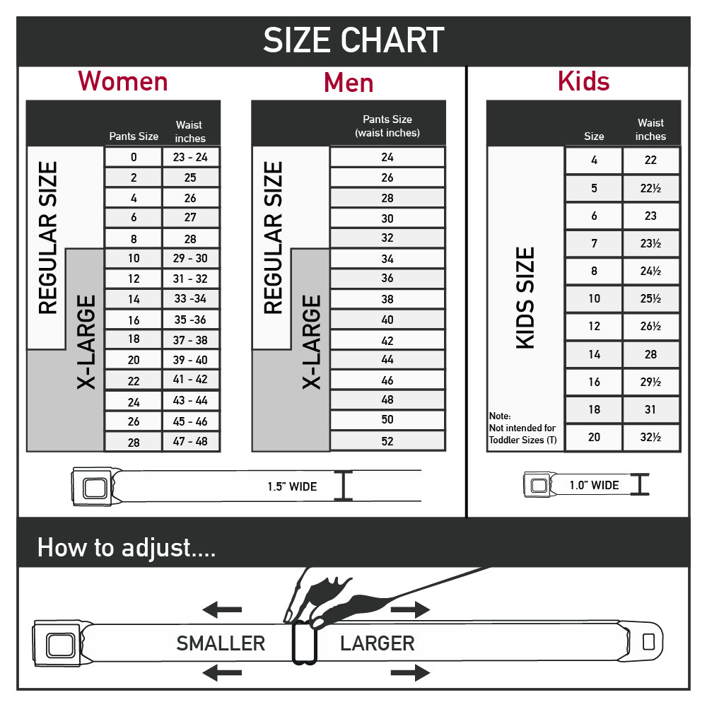 Buckle-Down's iconic Seatbelt Belt is a cool, smart, and exciting blend of fashion and function. Always a conversation starter, our Seatbelt Belt adjusts to perfectly fit your waist while showcasing your unique sense of style. Our Seatbelt Belts are made with authentic automotive style seatbelt buckles making them easy to open and close at the push of a button. Our adult-size Seatbelt Belts are 1.5 inches wide and our kid-sized Seatbelt belts are 1.0 inch wide. This product is Handcrafted in USA by Buckle-Down Inc. and officially licensed by GM General Motors.