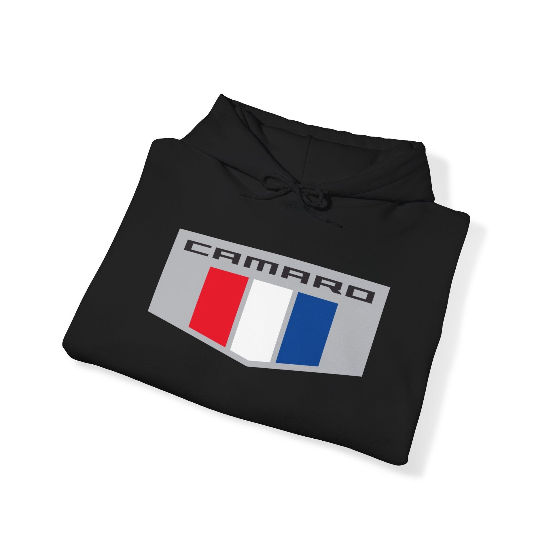 Choose this Camaro Tri Color Racing Flag Logo Unisex Fleece Hoodie and enjoy all it has to offer. This unisex heavy blend hooded sweatshirt is relaxation itself. Made with a thick blend of cotton and polyester, it feels plush, soft and warm, a perfect choice for any cold day. In the front, the spacious kangaroo pocket adds daily practicality while the hood's drawstring is the same color as the bas. It's soft, comfy, and can be easily styled with a pair of jeans and sneakers for a cozy, yet stylish look. Perfect for any Camaro Fan!