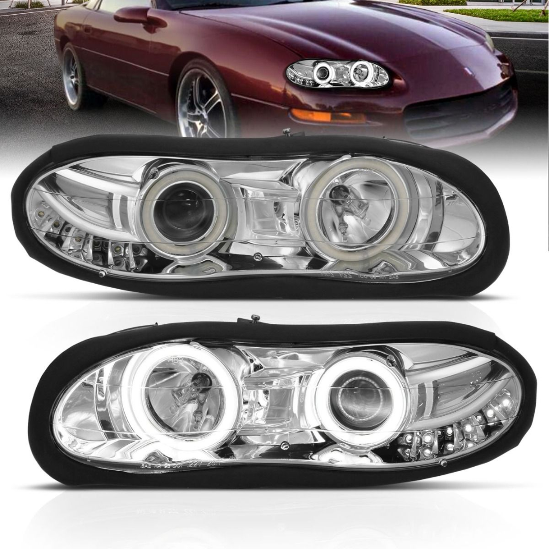 Drive your 4th Gen 1998-2002 Chevy Camaro in style with these sleek Chrome Projector Halo Headlights Black W/RX Halo, featuring a bold design that enhances both visibility and aesthetics. Crafted for a precise fit, these headlights offer a modern, aggressive look while delivering excellent performance. Perfect for Camaro enthusiasts looking to upgrade their vehicle’s appearance and lighting functionality.
