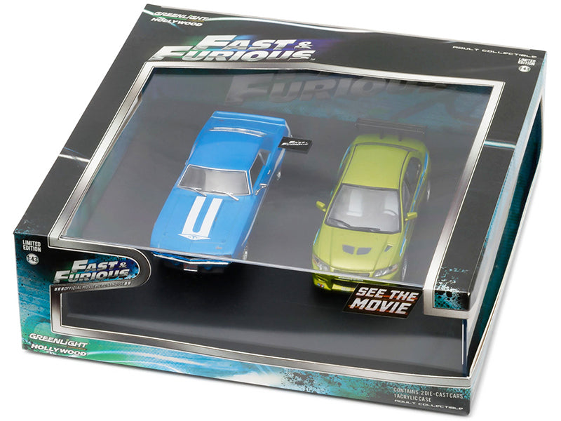 1969 Chevrolet Yenko Camaro Blue and 2002 Mitsubishi Lancer Evolution VII Green (Drag Scene) "2 Fast 2 Furious" (2003) Movie Diorama Set of 2 pieces 1:43 Die Cast Model Cars by Greenlight