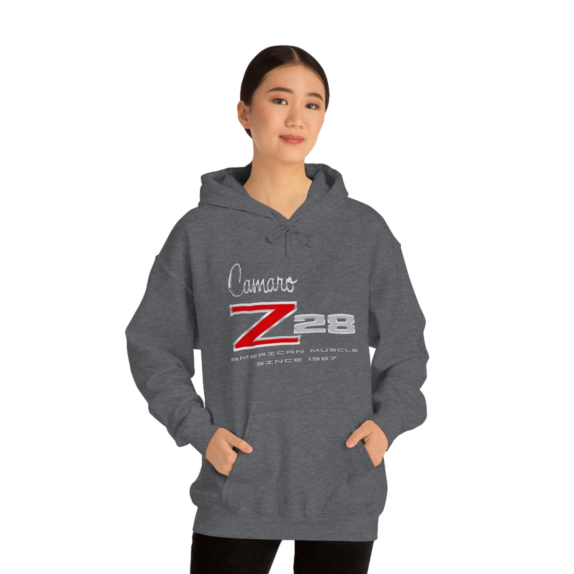 This Camaro 1st Gen Z28 heavy blend hooded sweatshirt is relaxation itself. Made with a thick blend of cotton and polyester, it feels plush, soft and warm, a perfect choice for any cold day. In the front, the spacious kangaroo pocket adds daily practicality while the hood's drawstring is the same color as the base sweater for extra style points.