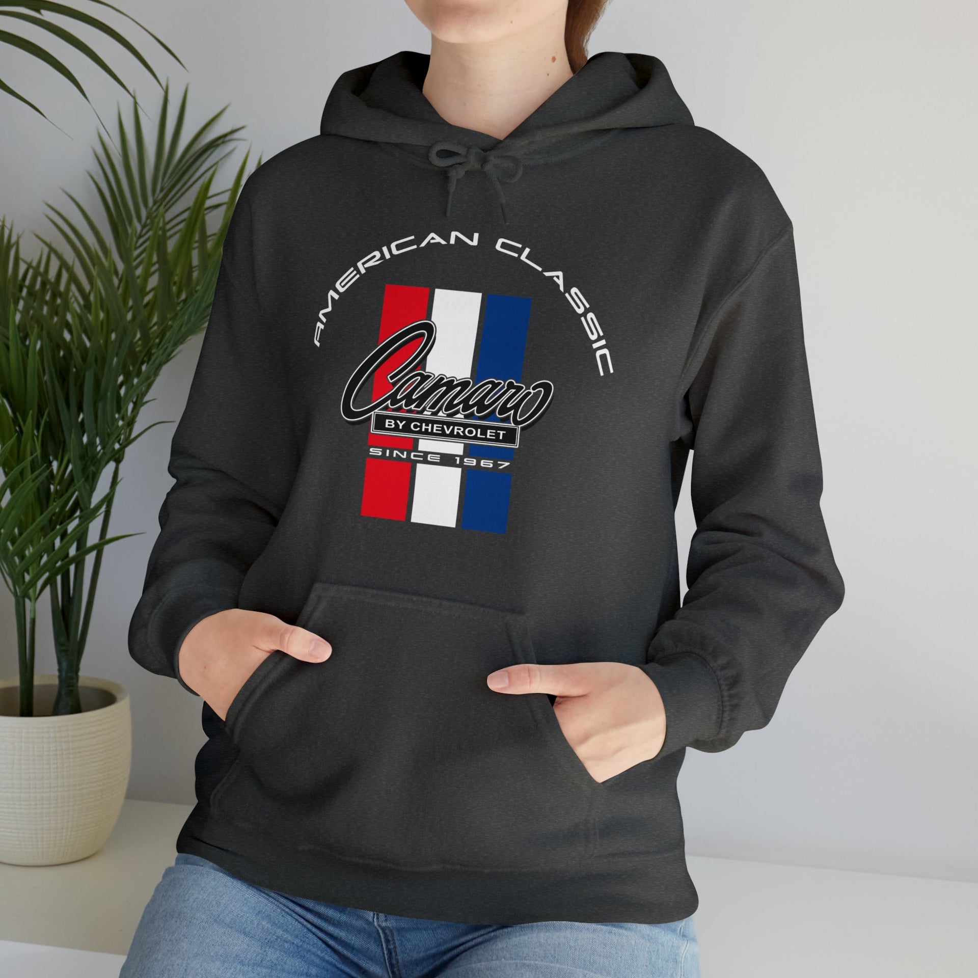 This Camaro 6th Gen 3 stripe RWB heavy blend hooded sweatshirt is relaxation itself. Made with a thick blend of cotton and polyester, it feels plush, soft and warm, a perfect choice for any cold day. In the front, the spacious kangaroo pocket adds daily practicality while the hood's drawstring is the same color as the base sweater for extra style points.