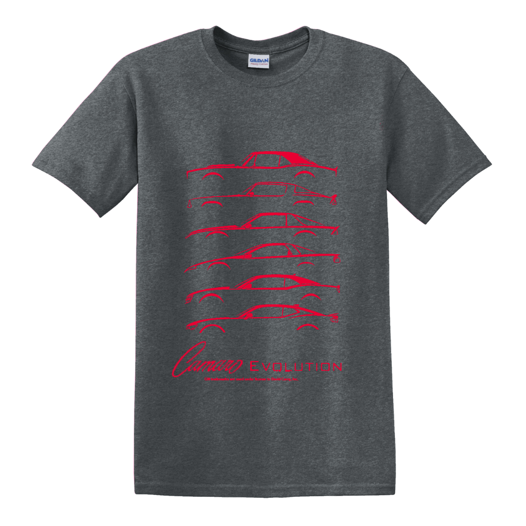 The Evolution of the Chevy Camaro series printed on the front of a 100% cotton dark heather grey t-shirt. Officially licensed by General Motors.