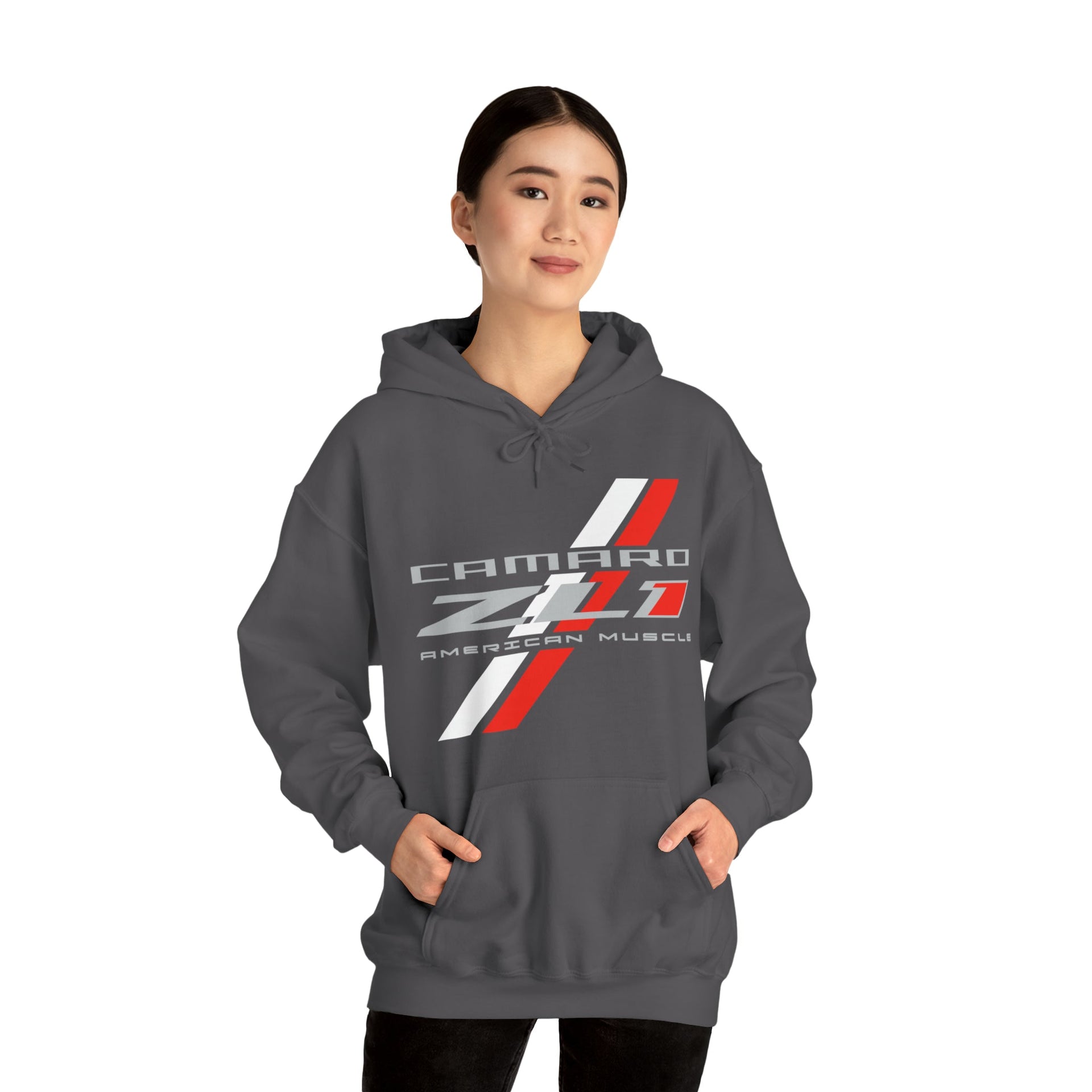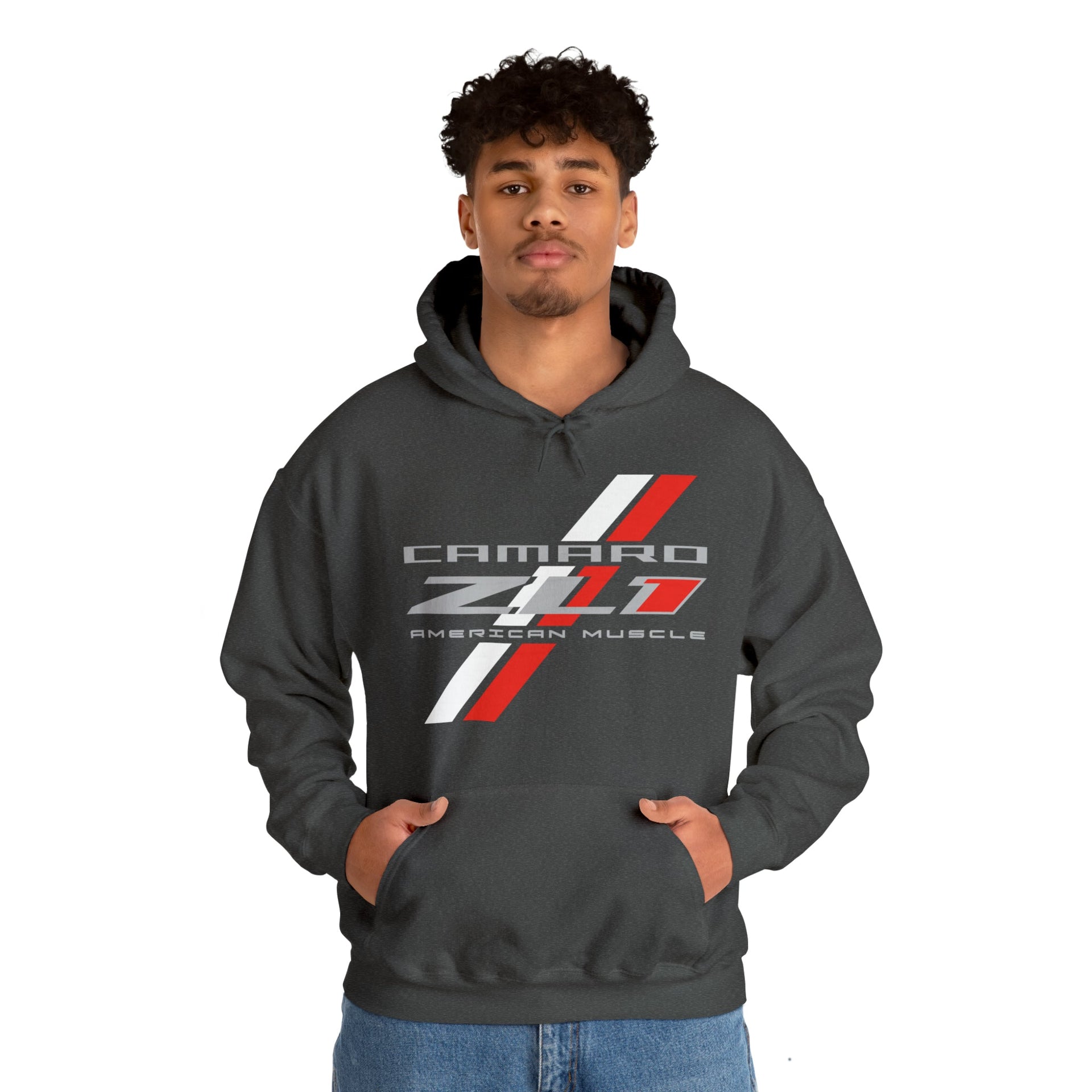 This Camaro ZL1 6th Gen heavy blend hooded sweatshirt is relaxation itself. Made with a thick blend of cotton and polyester, it feels plush, soft and warm, a perfect choice for any cold day. In the front, the spacious kangaroo pocket adds daily practicality while the hood's drawstring is the same color as the base sweater for extra style points.
