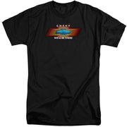 Celebrate your Chevrolet pride with the Chevrolet Well Be There TV Spot Adult Tall Fit Short Sleeve T-Shirt in classic black. Featuring the iconic "Well Be There" TV spot graphic, this t-shirt is designed for those who love to showcase their Chevrolet passion in style. Made from high-quality, breathable cotton, this shirt ensures both comfort and durability, making it perfect for everyday wear or casual outings.