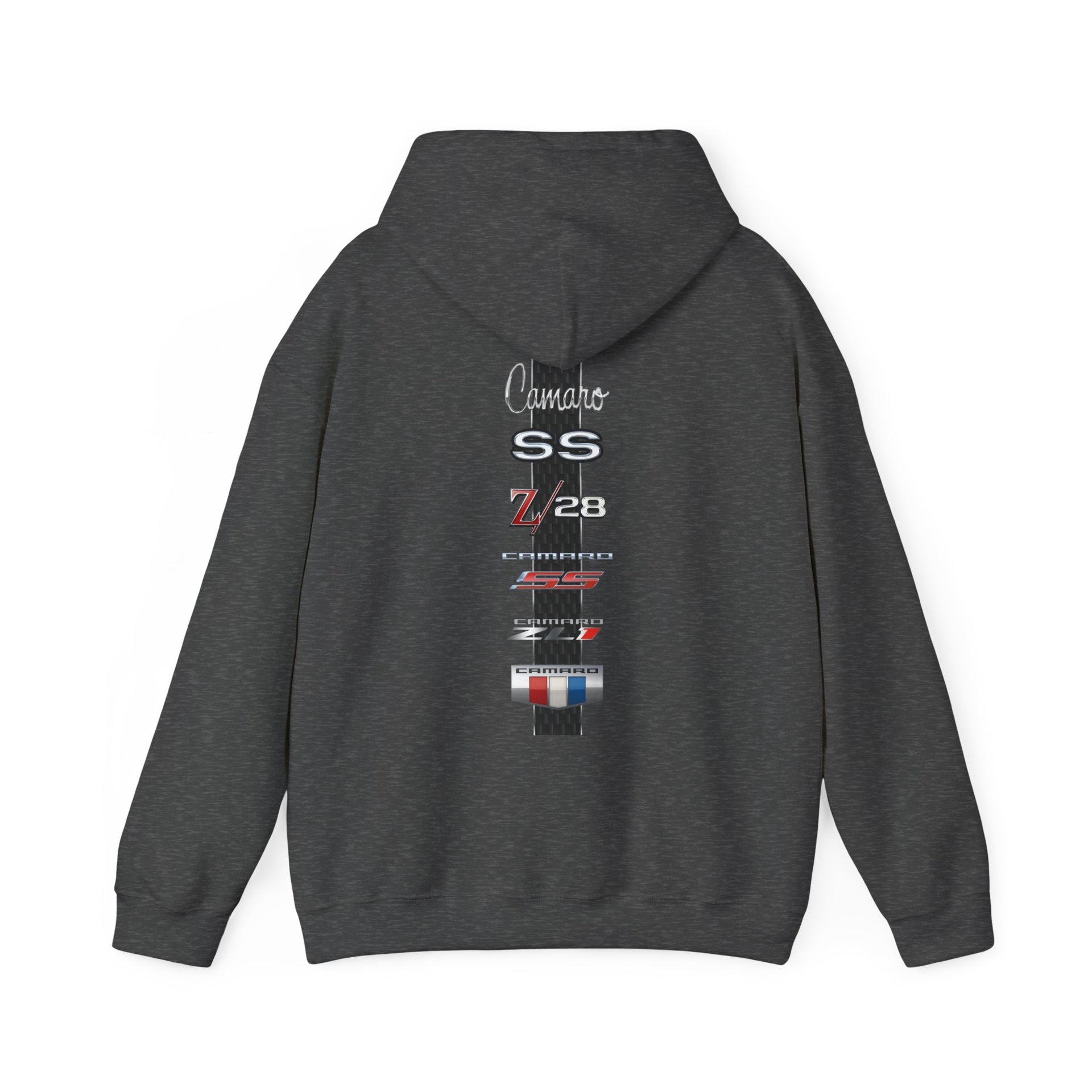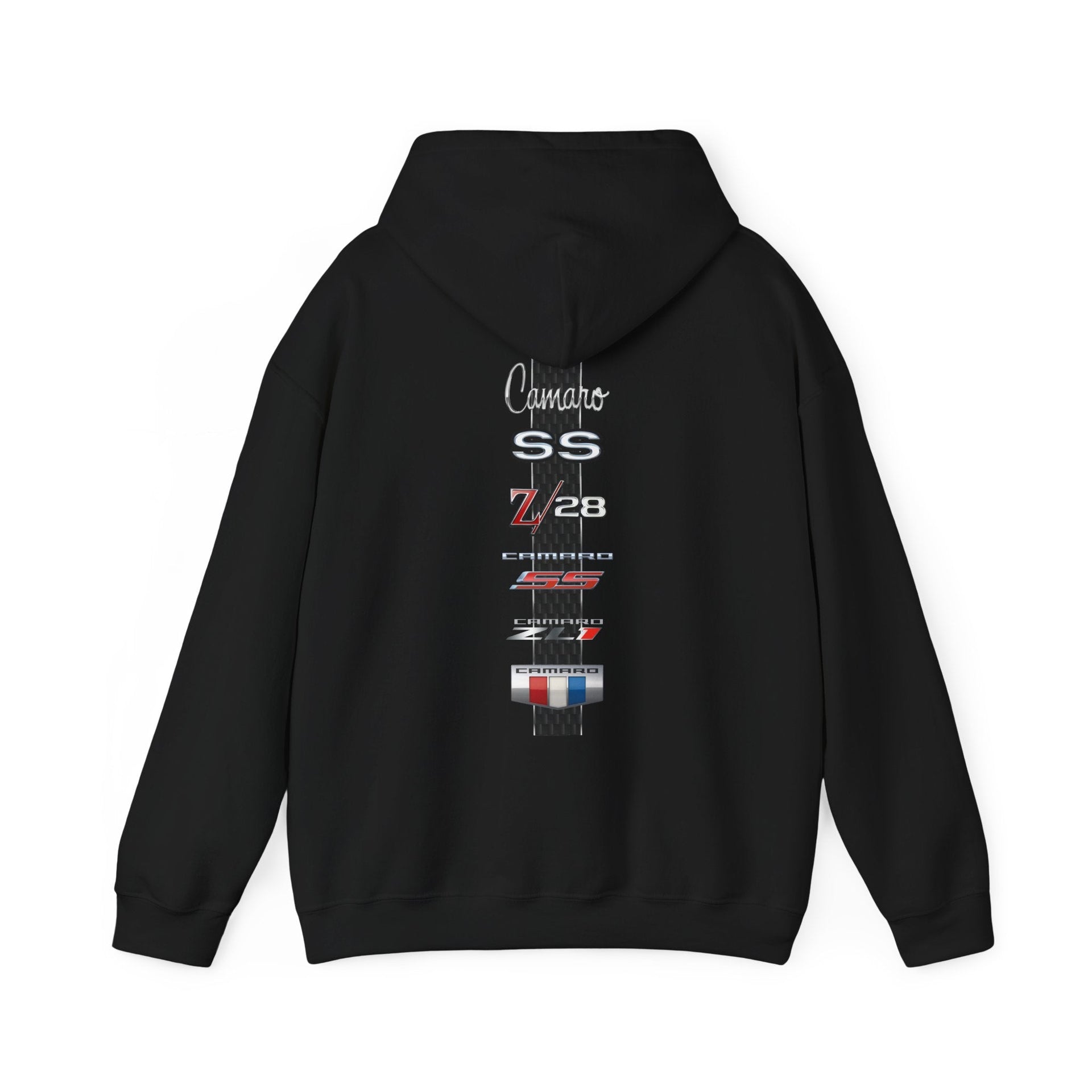 - Camaro Logo Placement: The back of the hoodie showcases multiple Camaro logos vertically arranged over a single striking carbon stripe for a dynamic, high-performance look