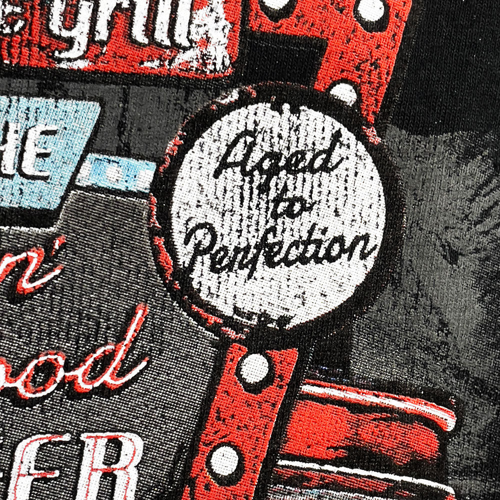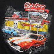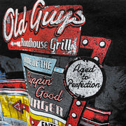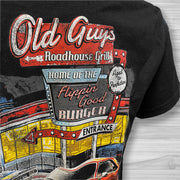 | Shirt Text: "Old Guys Roadhouse Grill - Home of the Flippin' Good Burger - Aged To Perfection!" |