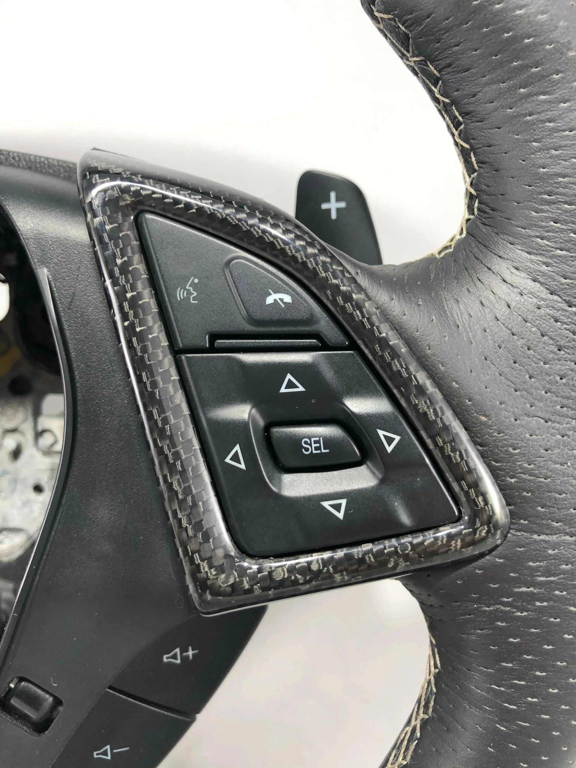 This carbon fiber interior Steering Wheel and Airbag Chrome Delete Cover is made using real carbon fiber with a glossy finish.