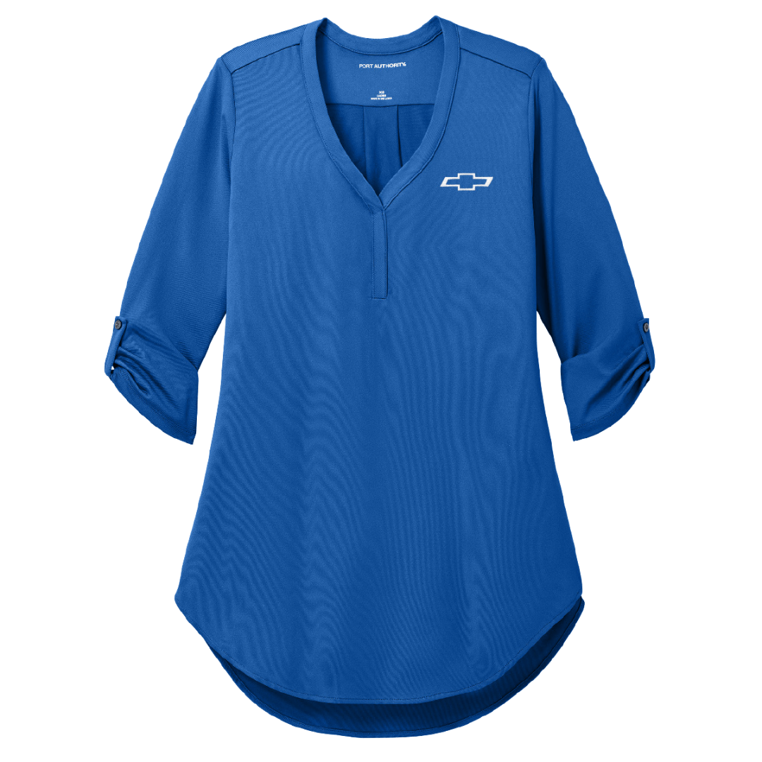 Introducing the Ladies Chevy Bowtie City Stretch 3/4-Sleeve Tunic – a perfect blend of style and comfort for the modern woman on the move.