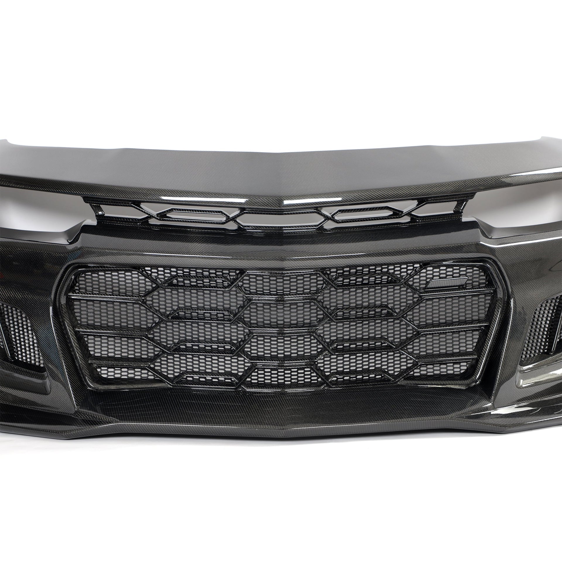 The full carbon fiber Black Panther Edition 1pc bumper conversion kit for the Gen 5 Camaro (2010-2015) is a premium aftermarket accessory designed to enhance both the look and performance of the vehicle. Featuring a high-quality carbon fiber construction, aggressive Black Panther-inspired design, and a lightweight, durable finish, this bumper kit offers numerous benefits including weight reduction, improved aerodynamics, and a distinctive aesthetic appeal. Installation should be carried out by professionals to ensure a perfect fit and finish.
